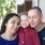 Professora sentada em banco de parque ao pôr do sol, cercada por flores, usando o celular.